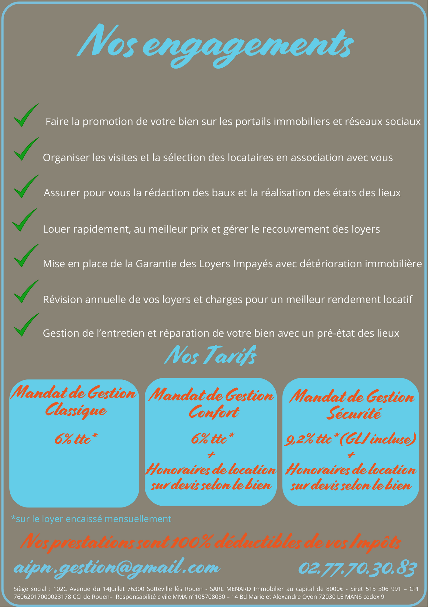 la publicité de votre bien les visites l'étude et la sélection des dossiers avec vous la signature du bail en agence ou à distance (signature électronique) les états des lieux d'entrées et de sorties émission d'avis d'échéance et de quittance des loyers
